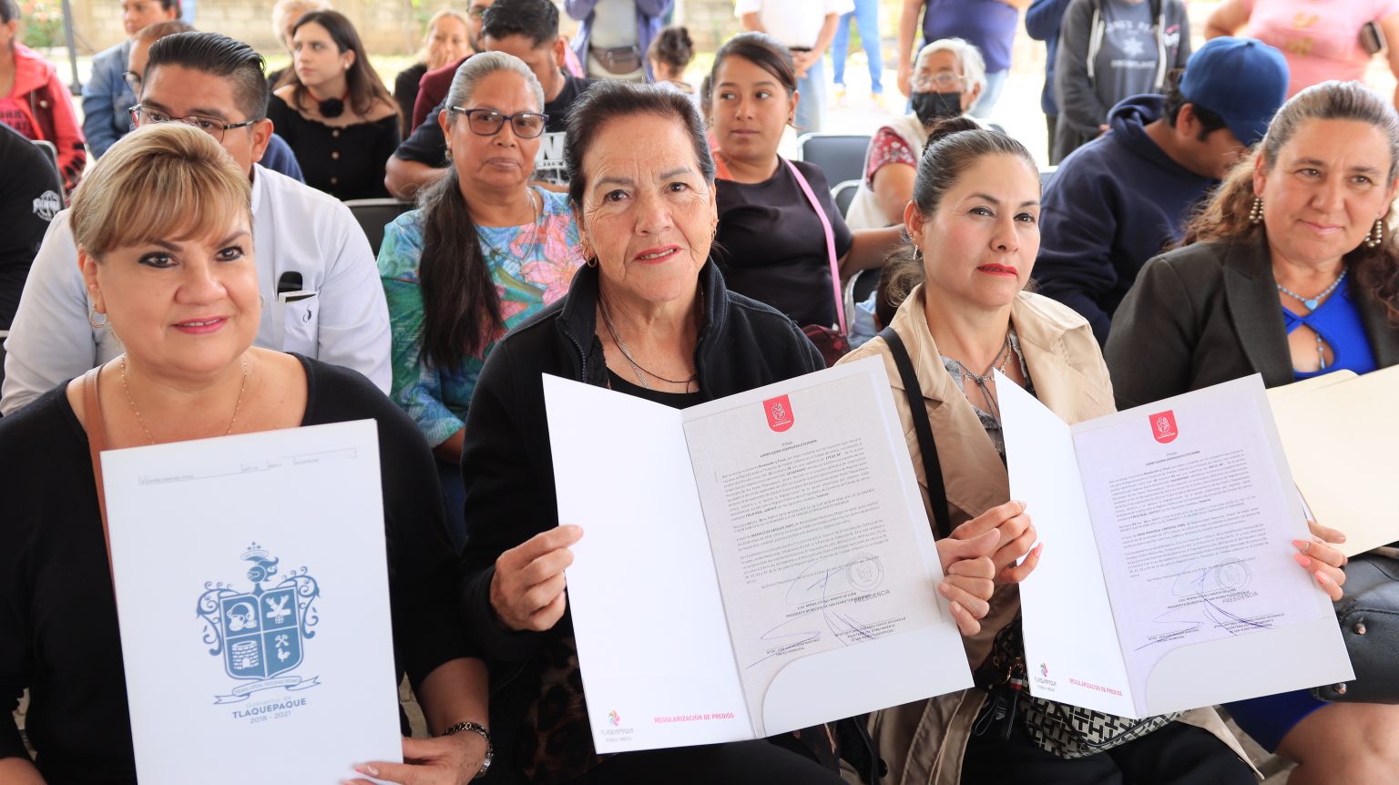 La presidenta municipal de San Pedro Tlaquepaque, Citlalli Amaya, entregó títulos de propiedad a 100 familias de 12 predios, garantizando seguridad jurídica en hogares de zonas como Las Liebres, El Aguacate y Rancho Nuevo III.