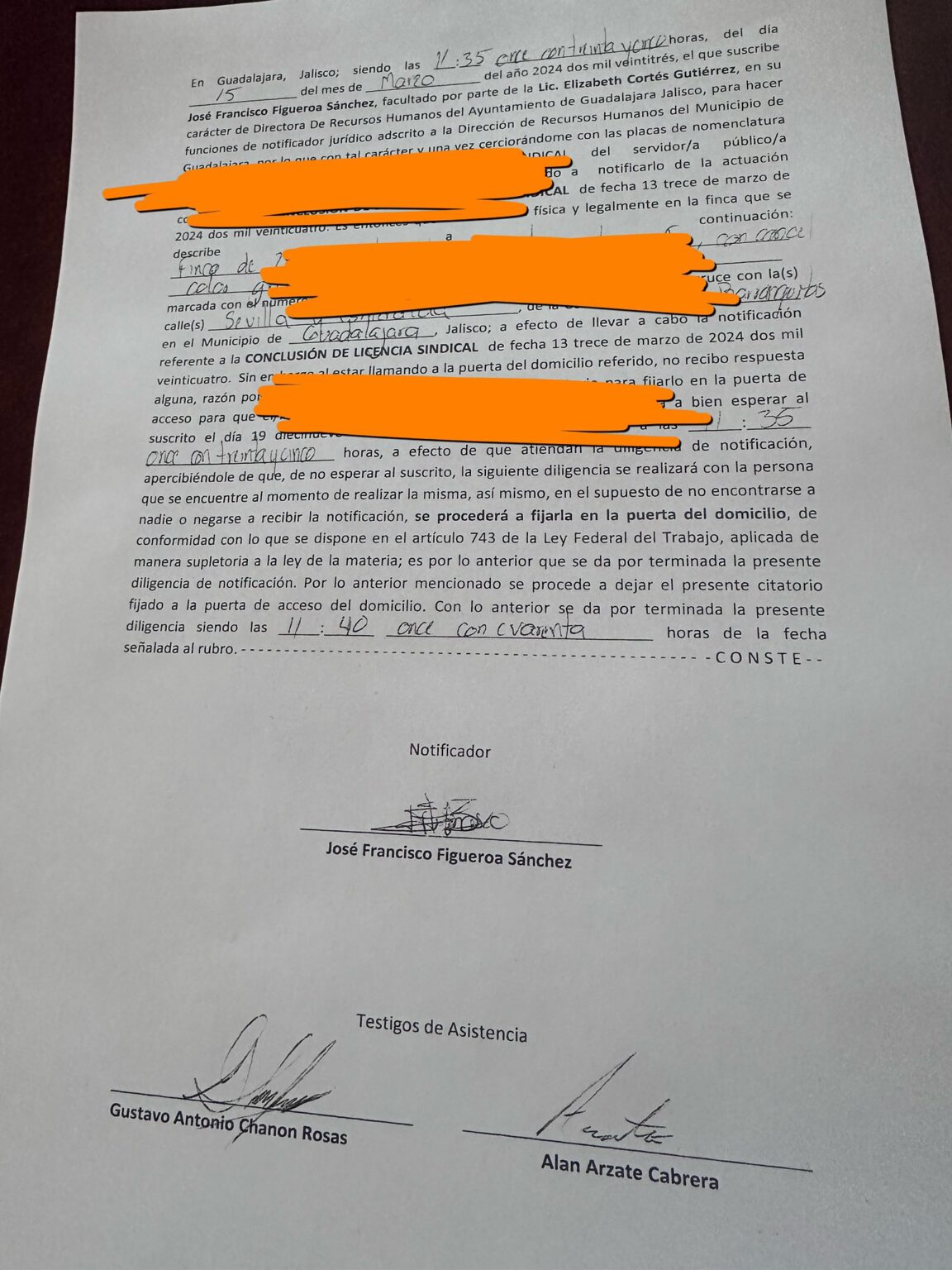 Estas supuestas «notificaciones» habrían sido emitidas en días inhábiles, supuestamente por instrucciones de la Lic. Elizabeth Cortes Gutiérrez, directora de recursos humanos del Ayuntamiento de Guadalajara.