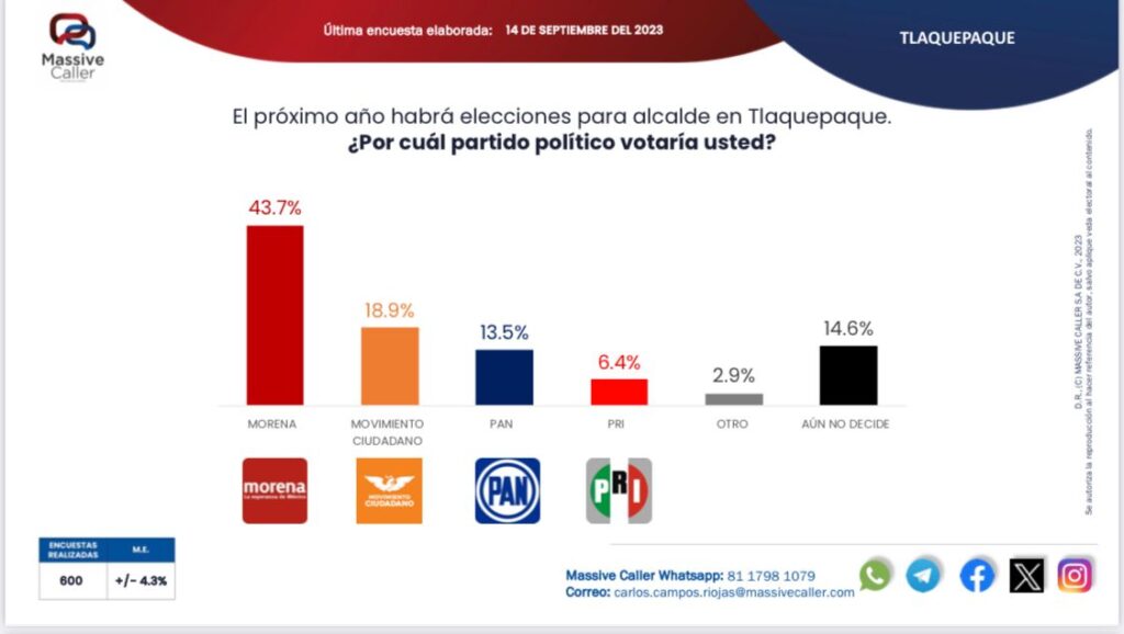 Morena lidera en encuesta en la Zona Metropolitana, especialmente en Tlaquepaque. Según Massive Caller, el partido de la 4T tiene un 43.7% de preferencia, seguido de MC con 18.9%, PAN con 13.5%, PRI con 6.4%, otros con 2.9%, y un 14.6% sin decidir.