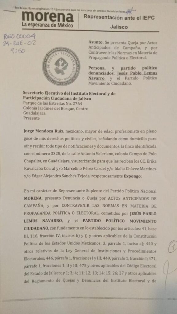 La Coordinadora de la pre candidata presidencial única de la Coalición “Sigamos Haciendo Historia” en Jalisco, Merilyn Gómez Pozos, ha denunciado ante el IEPC y el INE a Pablo Lemus de MC y Xóchitl Gálvez de la Alianza PRI-PAN-PRD por actos anticipados de campaña.