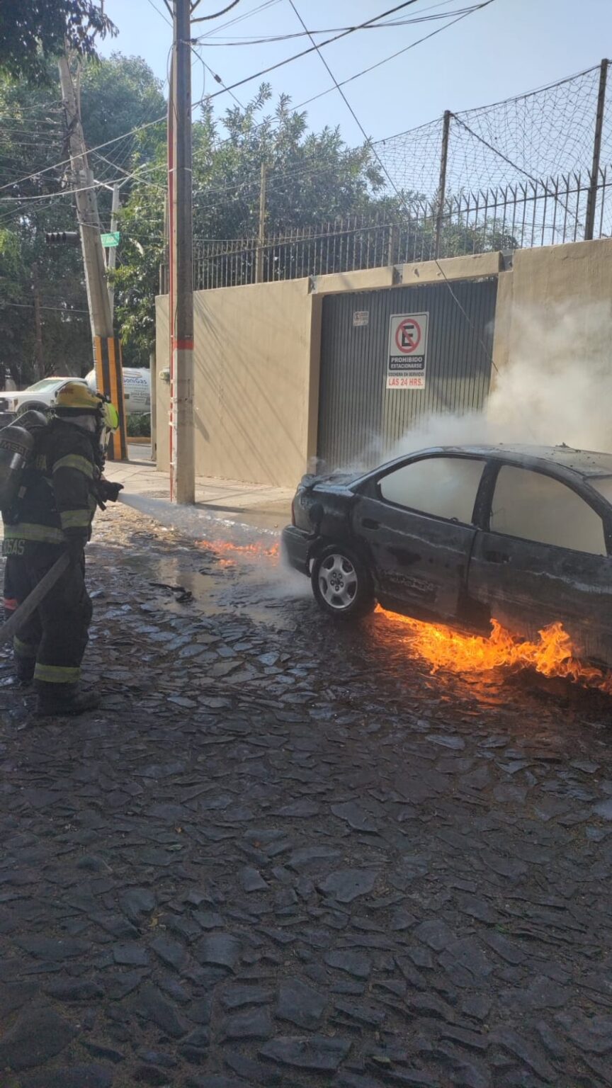 En la intersección de la calle Niños Héroes y Calzadas Xochimilco, en el municipio de Tlaquepaque, un vehículo se incendió por completo, afectando parcialmente a otro automóvil estacionado a su lado izquierdo en la parte trasera.